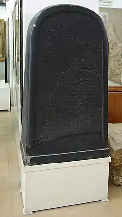 The stele is a smoothed block of basalt about a meter tall, 60 cm wide, and 60 cm thick, bearing a surviving inscription of 34 lines.[15]