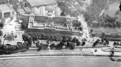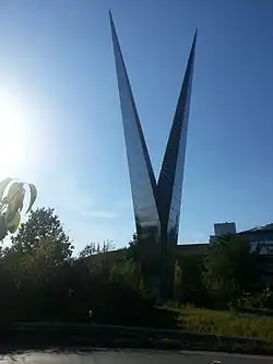 During the Nazi era, the Reich Exhibition Schaffendes Volk took place on the site of today's Nordpark in 1937.[5] This exhibition was strongly influenced by Nazi propaganda and served to showcase the National Socialist world view and the supposed superiority of the German people. Düsseldorf was named "Destination of the Year 1937" to attract as many visitors as possible. Achievements in the fields of materials, industry and economy, spatial planning and urban development, as well as garden culture and art were shown. Numerous buildings, sculptures and green spaces were built especially for this event and can still be seen in the Nordpark today. The exhibition highlighted the close links between trade fair activities and political propaganda during the Third Reich.