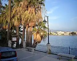 Located in the north-eastern corner of Sicily, on the western shore of the Strait of Messina (Ionian Sea)— altitude 3 m (9.8 ft) above sea level[20]— it extends for 213.75 km2 (82.53 sq mi) of municipal surface. Its extension on the coast (56 km (35 mi) from the coast of Giampilieri to the south to that of Orto Liuzzo to the north), which makes it the "longest" and most maritime city in Italy.[21]