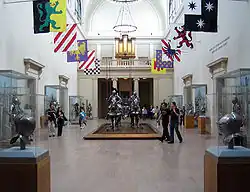 The Met's permanent collection is curated by seventeen separate departments, each with a specialized staff of curators and scholars, as well as six dedicated conservation departments and a Department of Scientific Research.[9] The permanent collection includes works of art from classical antiquity and ancient Egypt; paintings and sculptures from nearly all the European masters; and an extensive collection of American and modern art. The Met maintains extensive holdings of African, Asian, Oceanian, Byzantine, and Islamic art.[10] The museum is also home to encyclopedic collections of musical instruments, costumes and accessories, and antique weapons and armor from around the world.[11] A great number of period rooms, ranging from first-century Rome through modern American design, are permanently installed in the Met's galleries.[12] Since the late 1800s, the Museum has been collecting diverse materials from all over the world. Its outreach to "exhibition designers, architects, graphic designers, lighting designers, and production designers" helps the museum to maintain its collection in good condition.[13]