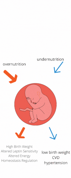Maternal undernutrition has been linked with low birth weight and also a number of diseases, including Cardiovascular disease, stroke, hypertension and diabetes.[7] When a foetus is in the womb and is not receiving sufficient nutrition, it can adapt to prioritize organ growth and increased metabolic efficiency to prepare itself for life in an energy deficient environment. Postnatally, when given the correct nutrition, babies exhibit ‘catch up growth’, potentially leading to obesity and other related complications. Studies based around restricting animals food intake throughout gestation have discovered that a reduction of just 30% of normal intake can cause low birth weight and increase sensitivity to high-fat-diet induced obesity.[8]