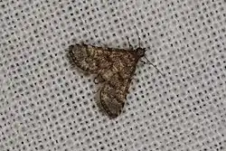 The wingspan is about 15 mm. The wings are pale brown with a pattern of dark brown zigzag lines.[2]