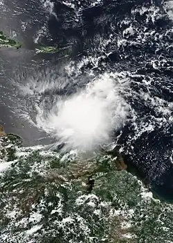 On August 12, a tropical wave moved off the west coast of Africa, accompanied by a large area of convection. The National Hurricane Center (NHC) began to track the wave the next morning, just before the convective mass dissipated.[2] The tropical wave was expected to merge with a broad area of low pressure located southwest of Cape Verde and slowly consolidate, with the NHC giving a low chance of tropical cyclogenesis over the next five days.[3] The merger failed to complete, however, with the two areas of disturbed weather remaining separate despite being contained by the same area of low pressure.[4] The two systems completely split on August 15, with the original low-pressure area continuing westwards towards the Caribbean Sea, while the tropical wave to the east moved farther north.[5] The tropical wave to the east would eventually become Potential Tropical Cyclone Ten off the coast of the Southeastern United States, which failed to develop into a tropical cyclone.[6][7] Conditions in the Caribbean Sea though were not forecast to be conducive for development.[5] Convection around the low began to increase that same day as a Kelvin wave passed through the area, but remained disorganized amid strong upper-level winds.[2] However, the NHC noted that the low could experience a slight reprieve near the Lesser Antilles.[8] On August 17, satellite imagery revealed that the system had become much more organized, with the circulation becoming better defined.[9] Assessing it as having a high chance of tropical cyclogenesis over the next two days, the NHC began issuing advisories at 15:00 UTC on Potential Tropical Cyclone Nine roughly 295 mi (475 km) east of Barbados; this allowed tropical cyclone warnings and watches to be issued for the Lesser Antilles.[10] Post-analysis revealed that a tropical depression had already formed by 06:00 UTC while located 505 mi (815 km) east of Barbados.[2]