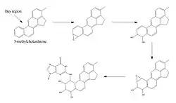A possible mechanism for this reaction is depicted in figure (2). 3-MC is metabolized, via epoxidation, hydrolysis and another epoxidation, to a very reactive epoxide. Epoxidations are realized by the enzyme cytochrome P450. The second epoxide is not hydrolysed immediately because it is localized next to a bay region, which shields the epoxide. This way, the metabolite is able to travel and bind to DNA in figure (2). The mechanism is derived from the binding mechanism of benzo[a]pyrene to DNA. This is likely because it is plausible that two polycyclic aromatic hydrocarbons are metabolized via the same pathway. Deoxyguanosine is used in the figure, since that base appears to be bound to Benzo[a]pyrene far more often than the other bases.[8][9]