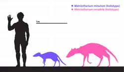 The Dichobuninae is described as consisting of larger-sized dichobunids. Metriotherium in particular is defined as being a large-sized dichobunid, a trait that separates it from its likely ancestor Dichobune, which is described as a medium-sized dichobunid. Synaphodus is a close relative to Metriotherium that is also defined as being large-sized similar to it.[10] M. mirabile is larger than both the earlier-appearing M. minutum and the later M. sarelense, both of which were recorded to be of similar sizes. M. mirabile also has larger molars compared to the other species,[9] including M. paulum, which is described as a very small species.[8][23] According to Theodor et al. in 2007, it is unclear if the older M. mirabile and the younger M. sarelense are actually distinct species or more representative of sexual dimorphism.[10]