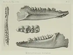 In 1906, the Swiss palaeontologist Hans Georg Stehlin discussed the taxonomic status of Metriotherium. Due to the similarities of the dental fossils assigned to the genera, Stehlin synonymized Deilotherium and Spaniotherium with Metriotherium as well as the former two genera's species (D. simplex and S. speciosum) with M. mirabile. He then erected the species M. paulum based on upper molars from the French commune of Bach.[7] In 1980, Michel Brunet and Jean Sudre erected M. minutum based on a right-side mandible with dentition from the French locality of Villebramar. The species name is simply based on the species' small size relative to others in the same genus.[8] In 2003, Jean Guy Astruc et al. listed the new species M. sarelense, a name credited to Sudre, one of the paper's coauthors. M. sarelense is based on dental remains, and its name is derived from its type locality of Sarèle, found in the French department of Gard.[9] According to Jessica M. Theodor in 2007, Metriotherium is "in need of revision" due to some species only being defined by isolated teeth.[10]