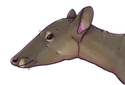 Dichobunoids are known for having the complete dental formula of 3.1.4.33.1.4.3 for a total of 44 teeth, consistent with the primitive dental formula for early-middle Palaeogene placental mammals.[18][19] This is the case for genera of the Dichobunidae like Metriotherium, whose teeth are not much separated by diastemata and are bunodont (low and rounded cusps). Except for some of the oldest genera, dichobunids are also described as having molars (M/m) that generally have five to six tubercles (or cusps) each.[20][8] The Dichobuninae is described as having unspecialized and rounded dentition, although it is more bunodont than in the earlier Diacodexeidae. In the upper premolars (P/p), the metaconule cusp is larger than the paraconule cusp. P3 has a protocone cusp while P4 has a metaconid cusp. P1 is premolariform in shape. The upper molars in dichobunines usually have three wide distal cusps along with a hypocone cusp.[10] Within the six-cusped molars, the paracone, metacone, protocone, and metaconule cusps are the major types present while the paraconule and hypocone cusps are the secondary ones.[21] In terms of cranial features, the Dichobuninae is diagnosed as having slightly elongated snouts.[10]