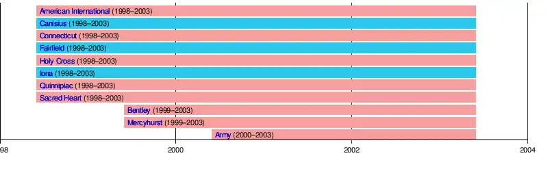 From 1997 to 2003, the MAAC sponsored ice hockey. At that time, the hockey league split from the MAAC and changed its name to the Atlantic Hockey Association (now Atlantic Hockey America after its 2024 merger with College Hockey America). Also, Marist College and Rider University moved the majority of their intercollegiate athletic programs to the MAAC in 1997 with the intent that the MAAC would enhance media exposure and competition for their men's and women's Division I basketball programs.[2]