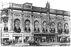 The auditorium had a capacity of 2,500,[5] was topped by a plaster ceiling dome from which hung a large chandelier, and had a matching pair of staircases leading to a mezzanine.[2] The exterior consisted of a light-brown bricks with ornamental terra cotta designs.[4] Fluted pilasters flank the arch windows, each of which is topped by a fanlight and a terra cotta swag and is fronted by a wrought-iron faux balcony.[15] The cornice is topped by a brick parapet and features low relief work of urns and friezes.[15]