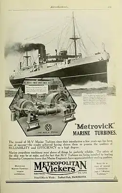In May 1917, control of the holding company was obtained jointly by the Metropolitan Carriage, Wagon and Finance Company, of Birmingham, chaired by Dudley Docker, and Vickers Limited, of Barrow-in-Furness.[2][3] On 15 March 1919, Docker agreed terms with Vickers, for Vickers to purchase all the shares of the Metropolitan Carriage, Wagon and Finance Company for almost £13 million.[2][3][4] On 8 September 1919, Vickers changed the name of the British Westinghouse Electrical and Manufacturing Company to Metropolitan Vickers Electrical Company.[2][3]