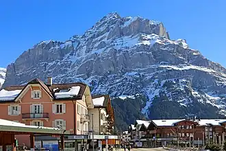 The Mettenberg from Grindelwald Dorfstrasse. The station of Pfingstegg is visible between the forest and the cliffs.