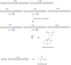 The biosynthesis of lovastatin occurs via an iterative type I polyketide synthase (PKS) pathway. The six genes that encode enzymes that are essential for the biosynthesis of lovastatin are lovB, lovC, lovA, lovD, lovG, and lovF .[41][42] The synthesis of dihydromonacolin L requires a total of 9-malonyl Coa .[41] It proceeds in the PKS pathway until it reaches (E) a hexaketide, where it undergoes a Diels-Alder cycloaddition to form the fused rings. After cyclization it continues through the PKS pathway until it reaches (I) a nonaketide, which then undergoes release from LovB through the thioesterase encoded by LovG. Dihydromonacolin L, (J), then undergoes oxidation and dehydration via a cytochrome P450 oxygenase encoded by LovA to obtain monacolin J, (L).