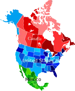 The North American Union (NAU) is a theoretical economic and political continental union of Canada, Mexico and the United States, the three largest and most populous countries in North America. The concept is loosely based on the European Union, occasionally including a common currency called the amero or the North American Dollar. A union of the North American continent, sometimes extending to Central and South America, has been the subject of academic concepts for over a century, as well as becoming a common trope in science fiction. One reason for the difficulty in realizing the concept is that individual developments in each region have failed to prioritize a larger union. Some form of union has been discussed or proposed in academic, business, and political circles for decades.[1][2][3] However, government officials from all three nations say there are no plans to create a North American Union and that no agreement to do so has been proposed, much less signed.[4][5][6] The formation of a North American Union has been the subject of various conspiracy theories.[7][8][9][10]