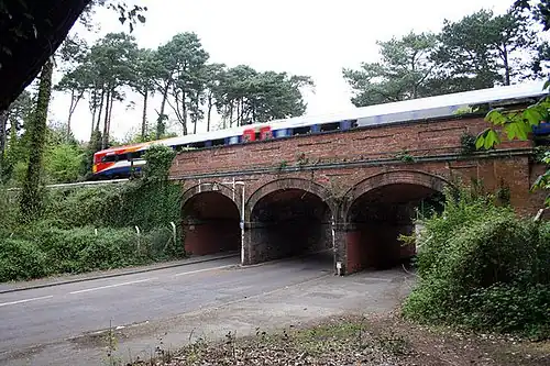 In May 1905, the London and South Western Railway's (LSWR) board approved the expenditure of £167 on the construction of a halt comprising two short wooden platforms and huts in a cutting on the South West Main Line.[1] Situated 55 chains (1.1 km) to the west of Bournemouth Central, the halt lay between the Central and West stations at a point halfway between Gasworks Junction and Central.[2][1] It was connected to the lower end of Meyrick Park Crescent in Bournemouth by two flights of steps.[1] The new station would serve the expanding suburb of Winton and Meyrick Park, an area of open space where an extensive golf links had been laid out.[1] The decision to provide the halt followed the recommendation of the LSWR's General Manager, Sir Charles Owens, in February 1905 to meet competition by trams in the Bournemouth area by introducing two steam rail motors which would supplement the existing local service.[3] Around ten irregular-interval journeys were to be made between Bournemouth West and Christchurch, with certain services extended to New Milton and Ringwood.[1][4] The station's opening coincided with the introduction of the service on 1 March 1906.[5][6]