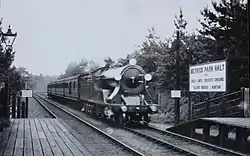 Trams were already well established in the area which led the Bournemouth Guardian newspaper to comment that, although the new station would be useful to golfers, the residents of Winton would most likely continue using the trams which were perceived as more flexible.[1] Local residents had in fact petitioned the LSWR for a station as early as 1894, but it is thought that even if one had been provided, its patronage would have been mostly lost to the trams in any case.[1] On 17 June 1914, 280 members of the Boscombe Corps of the Salvation Army made the short 1-mile-72-chain (3.1 km) trip from Meyrick Park Halt to Boscombe on the 7:40pm service from Bournemouth West to Christchurch.[7] This was probably the greatest number of people to ever board a train here; the railway company provided a conventional four coach train in place of the usual push-pull train, and a member of staff from Bournemouth Central was stationed at the halt to supervise boarding.[7]