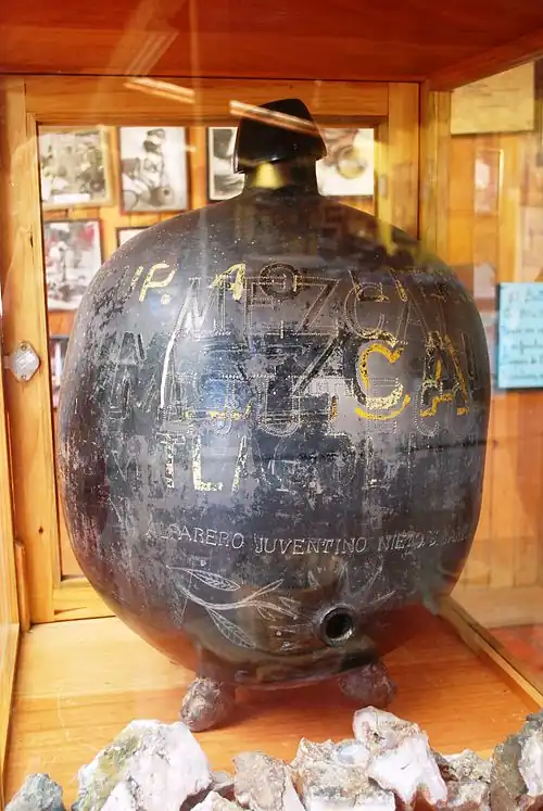 Filipino-type are very distinct from the more complex European-type alembic stills (derived from Arabic and Middle Eastern stills). They were cheap and easy to manufacture, though less efficient than alembic-type stills. They were made of a mixture of different easy-to-acquire materials. They usually consist of a hollowed-out log (usually from the parota tree) with two copper or iron pans. These were often substituted with larger capacity earthenware jars and bowls, bound wooden staves, or even metal cylinders. The upper pan is continually filled with cold water and functions as the condenser; while the bottom pan holds the fermented juice over the furnace, functioning as the boiler. The distillate is collected either by an internal container placed in between the two pans on a platform; or a spoon-shaped collector and gutter made from wood, rolled agave leaf, or carrizo cane (originally bamboo in the Philippines) that exits from the hollow log in between the pans to an external clay container. A modified version of this, usually called "olla de barro" (lit. "clay pot"), use a specially-shaped clay vessel (or overlapped clay vessels) built into a furnace as the boiler chamber (doing away with the hollow log and the bottom pan). It only uses one pan (the condenser), but otherwise operates on the same principle.[6] There are also many other modified variants, usually named after the indigenous peoples that use them, including the "Tarascan still" (or "Tarasco still"), "Zapoteco still", "Nahua still", "Bolaños still", and "Huichol still" (the latter used for making sotol, not mezcal).[9][8][10][4] Filipino-type stills are also still referred to by mezcal and tequila manufacturers (especially in Jalisco and Michoacán) as the "Filipino still" (destilador Filipino).[11]