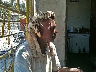 Thick circles of white around the eyes, a patch of red across the forehead, broad stripes of yellow are drawn down the cheeks, bands of red, white, or yellow run down the arms and across the chest.... His dress consists of the softened skins of wild animals, either whole or in strips, feathers of birds, dried fibres and leaves, ornaments of leopard, crocodile or rat's teeth, small tinkling bells, rattling seedpods...[4][5]