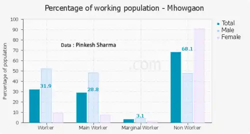Mhowgaon has 32% (9571) population engaged in either main or marginal works. 52% male and 9% female population are working population. 48% of total male population are main (full time) workers and 4% are marginal (part-time) workers. For women 7% of the total female population are main and 2% are marginal workers. Out of the total population, 9,571 were engaged in work or business activity. Of this 8,267 were males while 1,304 were females. In a census survey, a worker is defined as a person who does business, job, service, and cultivator and labour activity. Of total 9571 working population, 90.42% were engaged in Main Work while 9.58% of total workers were engaged in Marginal Work.
