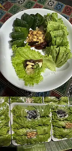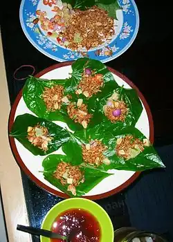 Miang kham is a snack food that originated in the Lao regions of Thailand, originally using pickled tea leaves (called miang in the northern Thai language).[1][3] The dish is mentioned in Epic of the Verse of foods, a book written by King Rama II.[4] In Thailand, Miang kham is usually eaten with family and friends. It is also popular in the Central Region of Thailand. This dish is mostly eaten during the raining season for it is then that cha phlu leaves are abundantly available, as it grows new leaves and shoots.