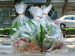 Miang Luang Prabang uses sticky rice paste in the place of dipping sauces. The paste is prepared by blending sticky rice puffs using a food processor and rehydrating the rice with a flavoring broth. The rice paste is spooned and wrapped together with vegetables, herbs and spices in a lolot leaf or lettuce, and served. Alternatively, for simplicity some people choose to pre-mix some of the herbs and spices with the rice paste during the blending process. This Lao snack is sold during festivals, in markets and on roadsides in Laos.[6] Miang can be tailored into a meal, for instance, by including grilled fish meat and Lao rice vermicelli (sen Khao poon) among the ingredients.
