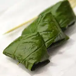 Before wrapping the filled leaves are topped with palm syrup or sugar cane syrup which often has been cooked with lemongrass, galangal, ginger and fish sauce.[5]