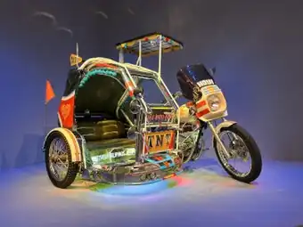 Arcega produced several public artworks during this later period, including three commissioned by the San Francisco Arts Commission: the permanent works Valencia Street Posts (2010) and Auspicious Clouds|Heavy Fog (2015)—a series of colorful cloud-motif benches in the Chinatown neighborhood—and TNT Traysikel (2018).[41][42][43][15] He created a similar series of flower-motif benches for the city of Berkeley, Wildflowers, Bloom! (San Pablo Park, 2020).[44] TNT Traysikel is a street-work collaboration with filmmaker Paolo Asuncion—a customized, traditional Filipino motorbike and covered sidecar, tricked out with sparkly lights, bright pom-poms and a functioning karaoke system.[8][45][15] Common to the streets of the Philippines but one of only four in North America, the vehicle is designed as a visible cultural marker of the Filipino-American community and humble symbol of Philippine ingenuity and labor.[15][46] It is inspired by the work of Carlos Villa, the artists' former mentor, who believed street life should inspire art.[8]