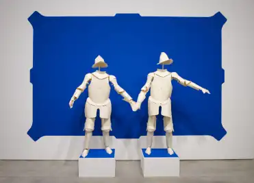 Further recognition followed for his performance and sculpture work, The Maiden Voyage of El Conquistadork (Lucky Tackle Gallery, 2004; Museum of Contemporary Art San Diego, 2005).[30][4] The project centered on his construction of a 10-foot-long replica Spanish galleon out of manila folders and rope, which he launched and sailed in Tomales Bay, referencing the historic Manila-Acapulco trade route and his own Philippines-to-Bay Area journey.[21][31][32] Critics described the vessel as surprisingly sturdy, "model-airplane intricate and authentic" (with detailed balustrades, cloth sail and tiny Manila-rope rigging), and witty in its fusion of colonial and modern office cultures;[21][31][30] The MCASD show included complimentary objects, such as faux-antique maps, seascapes, coats of arms, and Conquistadorkes I & II, two ornate, life-size suits of armor constructed from manila folders that stood goofily at attention holding hands, deflating the grandiosity of conventional museum displays that glorified war, privilege and conquest.[4][10][6]
