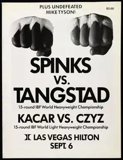 The Spinks–Tangstad main event was supplemented with a Bobby Czyz–Slobodan Kačar IBF light heavyweight title bout, in which Czyz would win his first of two world titles by knocking out Slobodan Kačar in the fifth round.[8] Also on the undercard, Mike Tyson knocked out Alfonso Ratliff in the second round in what was his final fight before entering the heavyweight unification series and challenging Trevor Berbick for the WBC heavyweight title.[9]