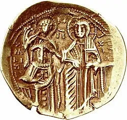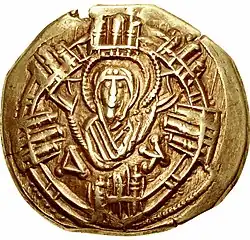 Coin of Michael VIII, depicting the Virgin Mary rising over the walls of Constantinople, in commemoration of the capture of the city over the Latins.