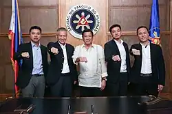 During the presidency of Rodrigo Duterte, Yang served as Duterte's economic adviser from 2016 to 2018. He was first designated the informal position in late 2016, and by 2018 entered into two six-month-long contracts in which he was formally named an economic adviser for the Duterte administration.[23] His position was initially denied by Duterte, who argued that Yang's Chinese citizenship constitutionally bars him from holding a cabinet position.[24] The two contracts were uncovered by the news site Rappler, which obtained them from the Malacanang Records Office through a freedom-of-information request.[23] According to presidential legal counsel Salvador Panelo, he was tapped for the role due to his rags to riches background, connections to the Chinese government and knowledge on Chinese culture.[21][25] Sometime after his designation, Yang established an office in Makati for his post, which was noted to have lavishly displayed the text "Office of the Presidential Economic Adviser" in the entrance.[11] A websites for his position ("www.opea.com.ph") was also registered and used, but has since become inaccessible by October 2018.[11]
