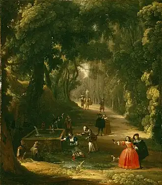 In his early genre works Cerquozzi showed his mastery of the style of Pieter van Laer and Jan Miel in their compact scale, anti-heroic subject-matter and dramatic chiaroscuro effects.[2] In these works Cerquozzi explored the humble life of the Roman people, among its ruins, in its taverns and their quarrels. He often set the scenes in Rome and the surrounding Campagna.[3] Cerquozzi was not a slavish follower of these Flemish and Dutch models and differed from them in his emphasis on contemporary narrative and anecdotal elements. He also introduced figures of higher social standing, a tendency also present in Jan Miel's work during the 1640s and 1650s.[2][12] Cerquozzi's Party in a garden with Roman artists (Kassel, Gemäldegalerie Alte Meister) displays typical bambocciata characteristics in its naturalism and small format. However, rather than the usual low-life figures it depicts groups of finely dressed men and women. These include the artist himself, his doctor Vincenzo Neri and other friends engaged in conversation and games.[2]