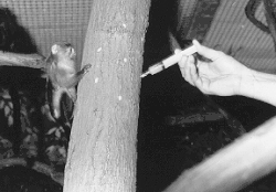 Black-tailed marmosets are diurnal and arboreal, using their claws to climb trees. Originally rain forest inhabitants, plantations have caused them to expanded them their range. They spend the night in tree hollows or in very close vegetation. They live together in small groups and mark their territory with scent glands, driving out intruders by shouting or by facial expressions, including lowered brows and guarded lips.