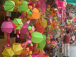 A notable part of celebrating the holiday is the carrying of brightly lit lanterns, lighting lanterns on towers, or floating sky lanterns.[1] Another tradition involving lanterns is to write riddles on them and have other people try to guess the answers (simplified Chinese: 灯谜; traditional Chinese: 燈謎; pinyin: dēng mí; lit. 'lantern riddles').[22]