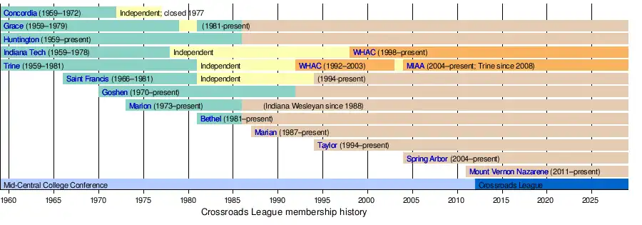 - 1959 – On June 1, 1959, the Crossroad League was founded as the Mid-Central College Conference (MCCC). Charter members included Concordia Senior College, Grace College (now Grace College & Seminary), Huntington College, Indiana Institute of Technology (Indiana Tech) and Tri-State College (now Trine University), beginning the 1959–60 academic year.