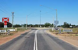 | A level crossing on Mid-Western Highway near Goolgowi, with a roundabout connecting with Kidman Way in the background. | |