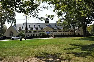 The oldest surviving building in the district is an 18th-century house, now on the grounds of the Westover School, whose campus is a major feature of the center. The oldest church in the district is the Greek Revival Methodist Church, built in 1832, although the 1935 Congregational Church is a reproduction of an 1845 Greek Revival building lost to fire. The adjacent town hall, a brick neo-Federalist brick building, was also built in 1935, the previous one having succumbed in the same fire. The Catholic St. John of the Cross Church, designed by architect John J. Dwyer of Hartford[3] and dedicated in 1908,[4] is a fine example of Colonial Revival architecture.[2]