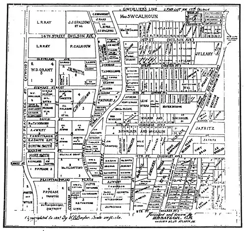 - ^ "Suburbs will not be annexed now: The Rice measure tabled by Council yesterday afternoon", Atlanta Constitution, October 27, 1897. North Atlanta was defined as the area including today's Midtown between Myrtle St. in the Midtown Historic District and Cherry St., now inside the Georgia Tech campus, as far north as 14th St (then called Wilson Ave.); most of what is now the Georgia Tech campus, south of what was then 5th Street; and the area west of Georgia Tech, south of Jefferson St., as far west as Ashby St. (now Lowery Blvd.), including today's English Avenue neighborhood.