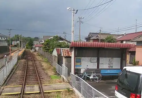 The station is on the ground level with one island platform and two tracks. The platform is narrow, and there are two benches on the platform. From the Shimabara end of the platform to the east side of the station, there is a level crossing (without alarms or barriers), which serves as the entrance and exit to the station. A covered waiting room is located next to the tracks just outside the level crossing..[1][2]