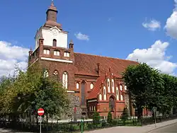 The first record of Bärwalde is a 1295[7] deed under the name of Berenwalde. Most likely, the settlement was owned by a knight of the von Behr family.[7][3] The settlement was developed following a grid of rectangular streets with a central market place.[3] In 1297, St. Mary's Church was first mentioned,[8] and another document gives 1298 as the year when Bärwalde was granted German town law.[7][3] In the late 13th and early 14th century the city walls were constructed,[9] much of which still exist, while the city gates were pulled down in 1867.