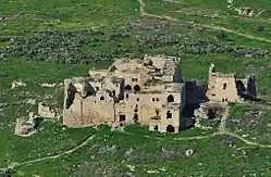 From a Byzantine-period church, a lintel set over a stone-built doorway survives, bearing the Greek inscription "ΜΑΡΤΥΡΙΟΝ ΤΟΥ ΑΓΙΟΥ ΚΗΡΥΚΟΥ", Martyr shrine (martyrion) of Saint Kyriko.[3][4] The room behind it was used by the al-Rayyan sheikh as a stable and for fodder storage.[4]