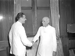 In 1953, Serrano—following a number of other family members—joined the Chilean diplomatic corps.[11] He hoped to gain a posting to India, a land which he considered to be a source of great spiritual truths. He was successful in this, and remained in India until 1962. In this period, he visited many Hindu temples and searched for evidence of the secretive Brahmanical order into which F. K. had alleged initiation.[11] In his role as a diplomat, he met various prominent figures, including Jawaharlal Nehru, Indira Gandhi, and the 14th Dalai Lama.[11] It was while in India that he wrote and published two books: The Visits of the Queen of Sheba (1960), which had a preface by Jung, and The Serpent of Paradise (1963), which discussed his experiences in the country.[11] Serrano had engaged in further correspondence with Jung between 1957 and 1961.[12] In 1965 his book, C. J. Jung and Hermann Hesse: A Record of Two Friendships, was published.[12]
