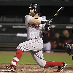 On December 3, 2012, Napoli agreed to a three-year, $39 million deal with the Boston Red Sox, pending a physical examination.[13] Following a six-week period during which the status of the deal was in question after his physical showed signs of a hip issue,[14] Napoli came to terms with the Red Sox on a one-year, $5 million deal with incentives that could make the deal worth $13 million. The incentives were to stay on the active roster for at least 165 days (which Napoli achieved), or get up to 625 plate appearances with at least 120 days on the roster.[15][16]
