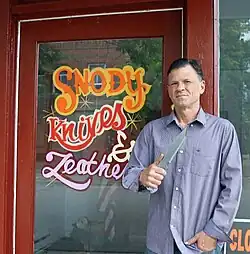 Snody worked as a Quality Control Inspector in the petroleum industry before making custom knives.[1][3] He began making Japanese influenced fixed-blade knives in 1998 and branched out into other designs by 2004 including Kitchen knives, Machetes, Fixed blade fighting knives, and Pocket Knives.[4] Most of his designs have a primary focus on self-defense or tactical applications.[1][5] He has used a variety of steel types in his knife construction over the years. A2, s35v, 154 cm, 440c and Damascus are the most commonly used. There are many examples of Titanium used in his Folding Knives. Titanium blades often have a carbonized edge for added toughness, since titanium is work hardened and not heat treated. Each sheath is hand made out of leather or kydex. The handle construction of his knives are simply wrapped in parachute cord also known as paracord or be embellished with exotic materials such as petrified dinosaur bone, giraffe bone, and Hippopotamus tooth. Snody often uses Timascus in his handle construction, which is a Titanium-based Damascus that anodizes at a different rate giving contrasting color in the pattern.[1]