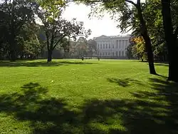 In 1817, Emperor Alexander I commissioned a major redevelopment of the area of the city between Nevsky Prospect and Palace Embankment, centred around a new palace complex for his younger brother, Grand Duke Michael Pavlovich.[5] The ensemble, the last palace ensemble built in the city, was the work of architect Carlo Rossi, and envisaged an entirely new arrangement for the gardens surrounding what became the Mikhailovsky Palace.[2][4] The greenhouses which covered the southern part of the garden became the site of the new palace, while the area stretching north from the palace to the Moyka became the palace garden and grounds.[1] Thus by 1825 it had become known as the Mikhailovsky Garden.[3] The plans for the garden were drawn up by Rossi and Adam Menelaws, and approved by the emperor in April 1822.[1][4] The land around the Mikhailovsky Castle was also redeveloped under the scheme, approved by Alexander in 1823, and involving the filling in of the Church Canal and part of the garden's eastern ornamental pond. The earlier water system, linking the garden's ponds with the castle's watercourses, was otherwise retained, and further expanded with an underground channel linking the garden's large pond with the Moyka. Rossi also retained Leblon and Rastrelli's practice of dividing the garden into sections, and planted new trees around the castle.[4]