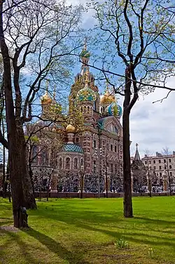 On 1 March 1881, Emperor Alexander II was assassinated by members of Narodnaya Volya while travelling along the Catherine Canal embankment beside the Mikhailovsky Garden. In memory of his father the new emperor, Alexander III, ordered the building of the Church of the Saviour on Blood on the site of the assassination. The church took up part the western edge of the garden, and was separated from it by an Art Nouveau-style fence designed by Alfred Parland and created by Karl Vinkler between 1903 and 1907.[1][2][3][4] By 1898 the palace had ceased to be a grand ducal residence, and was bought back by the state for use as the home of the Museum of Emperor Alexander III, now the Russian Museum.[2] Both the palace and garden were opened to the public, though a sign on the entrance forbade entry to dogs and soldiers.[3] The redevelopment of the palace complex in the early 1900s, with the construction of the museum's ethnographic department, reduced the size of the garden slightly, while in 1902 the eastern pond was filled in.[1][3][4]