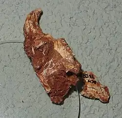 This animal, despite belonging to the Muridae, was much larger in size than its modern equivalents. The only known skull of the largest species, Mikrotia magna, was about 10 centimetres (3.9 in) long. The three known species of the genus Mikrotia show an evolutionary tendency towards the development of hypsodontal molars (with a high crown) and in the increase of the number of dental lobes in the first lower molar (as happened later to modern voles). The oldest specimens of the genus were still characterized by a dental pattern typical of murids, consisting of a succession of three parallel rows of cusps.[1] However, an additional lobe was already present in the anterior part of the lower first molar. In a rather rapid evolutionary succession, various successive species of Mikrotia developed more and more additional lobes and increased hypsodontia. In the last and largest species, M. magna, the first lower molar had acquired a pattern totally similar to that of voles, with six rows of transverse ridges.[1]