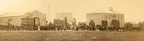 Throughout this period of change, primary producers in the Murray mouth region were disadvantaged by the comparatively higher costs of either transporting produce overland to Adelaide by dray or by coastal shipping, since the Port Victor line had not been extended further north than Strathalbyn.[6] Eventually the South Australian parliament appointed a select committee to investigate building a connecting line of about 30 km (19 mi) from Strathalbyn to the Adelaide–Melbourne line then under construction.[6]