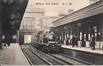 The North London Railway from Dalston Junction to Highbury & Islington was opened on 26 September 1850, although the station was not opened until 1 January 1880.[1] It was closed by the London, Midland and Scottish Railway on 1 October 1934.[2] The ticket office that was located on brick columns over the eastbound track was demolished in 1987. Some remnants of the platforms are still visible from what in 2024 were renamed the London Overground Mildmay and Windrush lines.