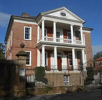 The Miles Brewton House is a National Historic Landmark residential complex located in Charleston, South Carolina. It is one of the finest examples of a double house (a reference to the arrangement of four main rooms per floor, separated by a central stair hall) in Charleston, designed on principles articulated by Andrea Palladio. Located on two acres, its extensive collection of dependencies makes it one of the most complete Georgian townhouse complexes in America. The house was built ca. 1765-1769 for Miles Brewton, a wealthy slave trader and planter.[3]