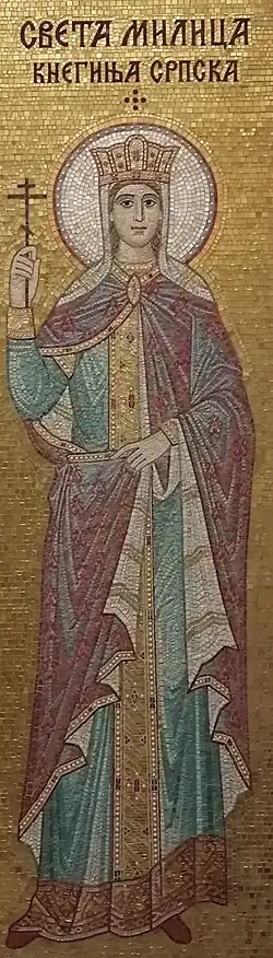Princess Milica Hrebeljanović née Nemanjić (Serbian: Милица Немањић Хребељановић · ca. 1335 – November 11, 1405) also known as Empress (Tsaritsa) Milica, was a royal consort of Serbia by marriage to Prince Lazar, who fell in the Battle of Kosovo. After her husband's death, she took the role as queen regent of Serbia from 1389 to 1393, until her son, despot Stefan Lazarević came of age.
